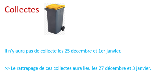 >> Le rattrapage de ces collectes aura lieu les 27 décembre et 3 janvier.
