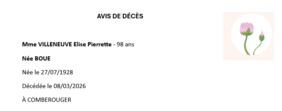 Mme VILLENEUVE Elise Pierrette - 98 ans
