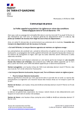Ce lundi, compte tenu du contexte très évolutif qui va perdurer au moins jusqu’en milieu de semaine, le Préfet appelle la population tarn-et-garonnaise à une vigilance de chaque instant et à se tenir informée de l’évolution de la situation.
