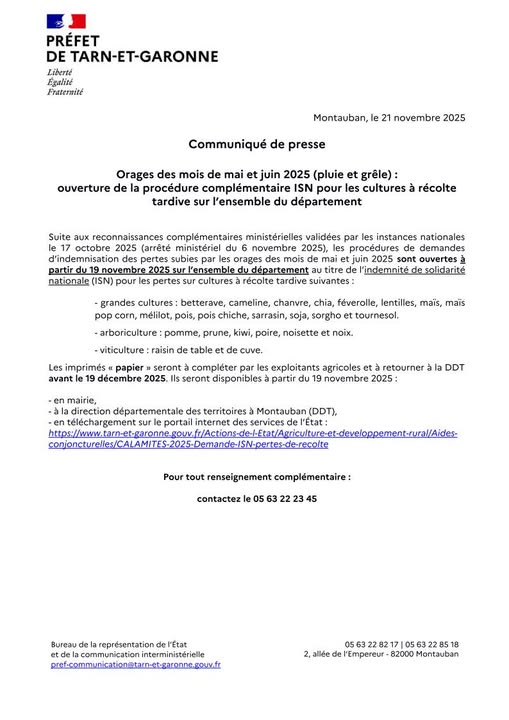 Communiqué > Orages des mois de mai et juin 2025 (pluie et grêle) : ouverture de la procédure complémentaire ISN pour les cultures à récolte tardive sur l’ensemble du département